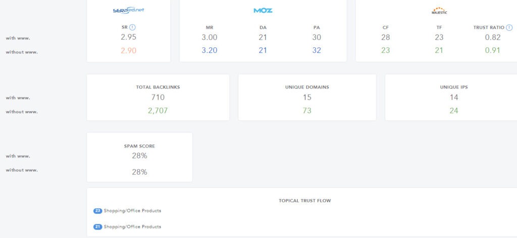 Both these scores reflect the quantity and quality of hyperlinks on other websites that point to your site. You currently have about 710 Backlinks.